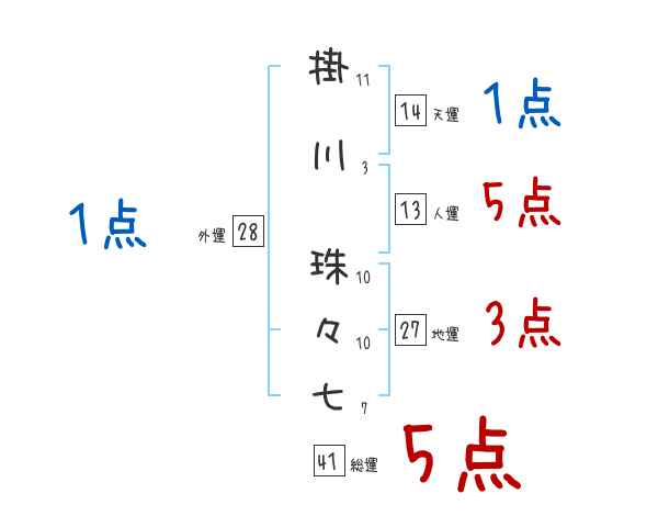 天運![]() | 掛川珠々七さんの天運は14画の1つ星!人に対して優しいがストレスを溜め込みがち。人間関係のトラブルを避けるよう気をつけましょう。 家系が持つ宿命的な運勢を表します。祖先から受け継いだ苗字ですので自分の力が及びません。家柄を象徴します。 |