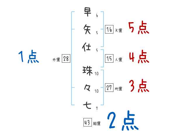 天運![]() | 早矢仕珠々七さんの天運は16画の5つ星!人望が厚く大きく発展する。逆転成功が見える。 家系が持つ宿命的な運勢を表します。祖先から受け継いだ苗字ですので自分の力が及びません。家柄を象徴します。 |