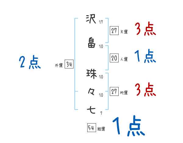 外運![]() | 沢畠珠々七さんの外運は34画の2つ星!独創性に優れるが、自尊心が強く災難に注意しましょう。 生活面を象徴する運勢です。外部から受ける影響力を表し、結婚運、家庭運や職場、環境への順応性を表します。 |