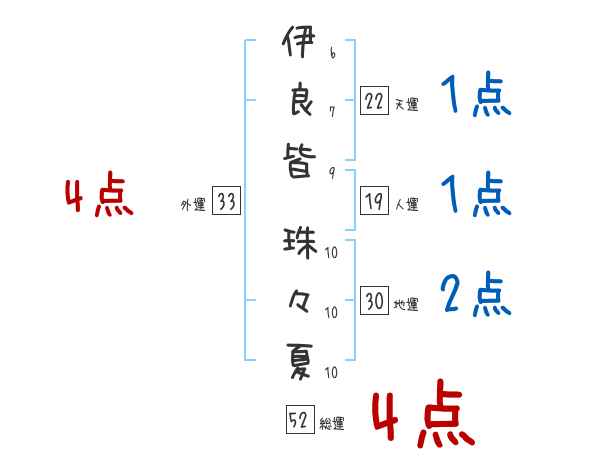 外運![]() | 伊良皆珠々夏さんの外運は33画の4つ星!権力志向でプライドが高い。勇気があり運を切り開き成功する。 生活面を象徴する運勢です。外部から受ける影響力を表し、結婚運、家庭運や職場、環境への順応性を表します。 |