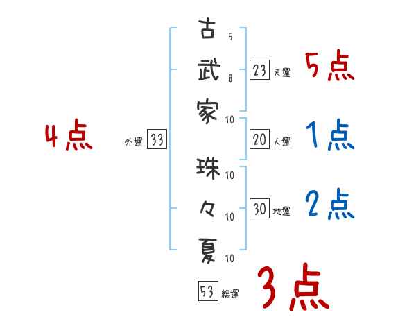 天運![]() | 古武家珠々夏さんの天運は23画の5つ星!想像力に優れ活力がある。一代で成功し名誉を手に入れる。 家系が持つ宿命的な運勢を表します。祖先から受け継いだ苗字ですので自分の力が及びません。家柄を象徴します。 |