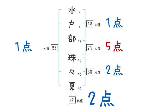 天運![]() | 水戸部珠々夏さんの天運は19画の1つ星!優れた才能を持ちますが、協調性が足りないことも。周りの人と協力する事を意識しましょう。 家系が持つ宿命的な運勢を表します。祖先から受け継いだ苗字ですので自分の力が及びません。家柄を象徴します。 |