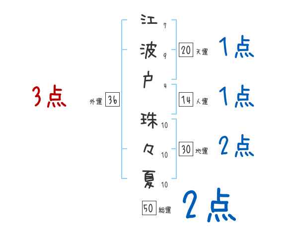 外運![]() | 江波戸珠々夏さんの外運は36画の3つ星!先見性が豊かです。多少神経質で苦労することも。 生活面を象徴する運勢です。外部から受ける影響力を表し、結婚運、家庭運や職場、環境への順応性を表します。 |