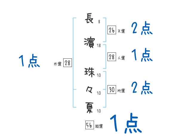 天運![]() | 長濵珠々夏さんの天運は26画の2つ星!波瀾万丈かも。信頼できる人を大事にしましょう。 家系が持つ宿命的な運勢を表します。祖先から受け継いだ苗字ですので自分の力が及びません。家柄を象徴します。 |