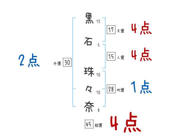 外運![]() | 黒石珠々奈さんの外運は30画の2つ星!浮き沈みの激しさに注意しましょう。 生活面を象徴する運勢です。外部から受ける影響力を表し、結婚運、家庭運や職場、環境への順応性を表します。 |