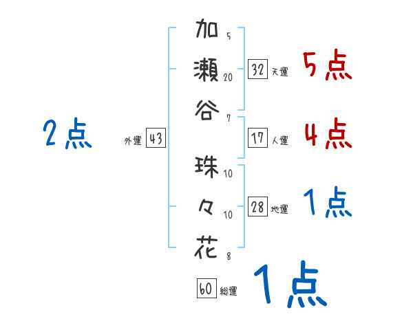 天運![]() | 加瀬谷珠々花さんの天運は32画の5つ星!柔軟性があり成功する。チャンスが多く金運が良い。 家系が持つ宿命的な運勢を表します。祖先から受け継いだ苗字ですので自分の力が及びません。家柄を象徴します。 |