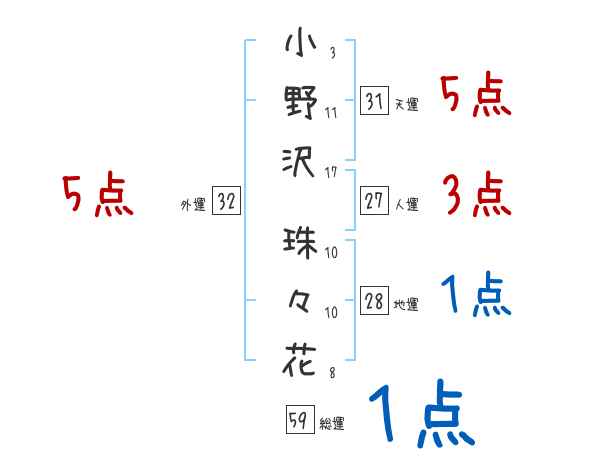 外運![]() | 小野沢珠々花さんの外運は32画の5つ星!柔軟性があり成功する。チャンスが多く金運が良い。 生活面を象徴する運勢です。外部から受ける影響力を表し、結婚運、家庭運や職場、環境への順応性を表します。 |