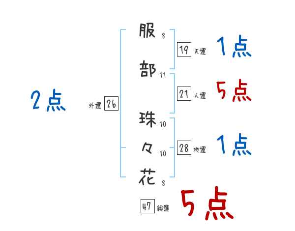 外運![]() | 服部珠々花さんの外運は26画の2つ星!波瀾万丈かも。信頼できる人を大事にしましょう。 生活面を象徴する運勢です。外部から受ける影響力を表し、結婚運、家庭運や職場、環境への順応性を表します。 |