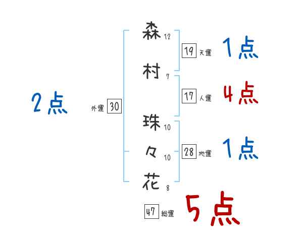 総運![]() | 森村珠々花さんの総運は47画の5つ星!実力が開花し発展する円満な人生。財に恵まれる。 あなたの人生を表す1番重要な運勢です。生涯を通じて影響する総合運となり、主に50歳以降の晩年期に影響を及ぼします。 |