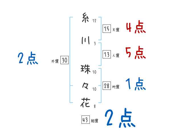 総運![]() | 糸川珠々花さんの総運は43画の2つ星!頑固な性格で独立心が強いかも。やや非現実的で浪費に注意しましょう。 あなたの人生を表す1番重要な運勢です。生涯を通じて影響する総合運となり、主に50歳以降の晩年期に影響を及ぼします。 |
