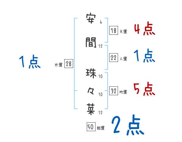 外運![]() | 安間珠々菜さんの外運は28画の1つ星!家庭環境に注意。スポーツで活躍できる能力があるかも。 生活面を象徴する運勢です。外部から受ける影響力を表し、結婚運、家庭運や職場、環境への順応性を表します。 |