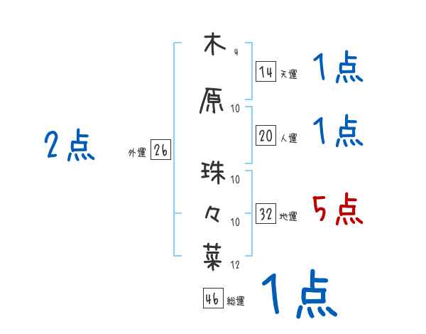 外運![]() | 木原珠々菜さんの外運は26画の2つ星!波瀾万丈かも。信頼できる人を大事にしましょう。 生活面を象徴する運勢です。外部から受ける影響力を表し、結婚運、家庭運や職場、環境への順応性を表します。 |