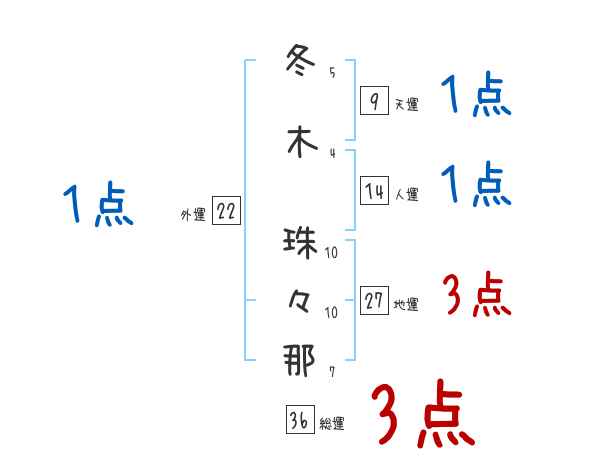 天運![]() | 冬木珠々那さんの天運は9画の1つ星!消極的で才能を発揮することが苦手なことも。周りの意見に耳を傾けましょう。 家系が持つ宿命的な運勢を表します。祖先から受け継いだ苗字ですので自分の力が及びません。家柄を象徴します。 |