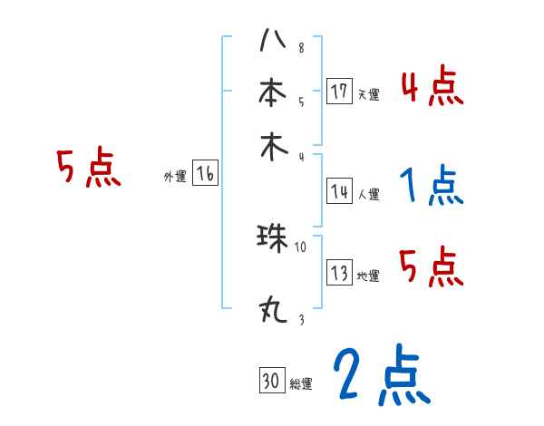 外運![]() | 八本木珠丸さんの外運は16画の5つ星!人望が厚く大きく発展する。逆転成功が見える。 生活面を象徴する運勢です。外部から受ける影響力を表し、結婚運、家庭運や職場、環境への順応性を表します。 |