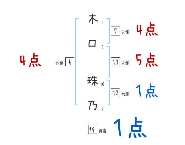 天運![]() | 木口珠乃さんの天運は7画の4つ星!強い意志や信念を持ち独立心が強い。自立する。 家系が持つ宿命的な運勢を表します。祖先から受け継いだ苗字ですので自分の力が及びません。家柄を象徴します。 |