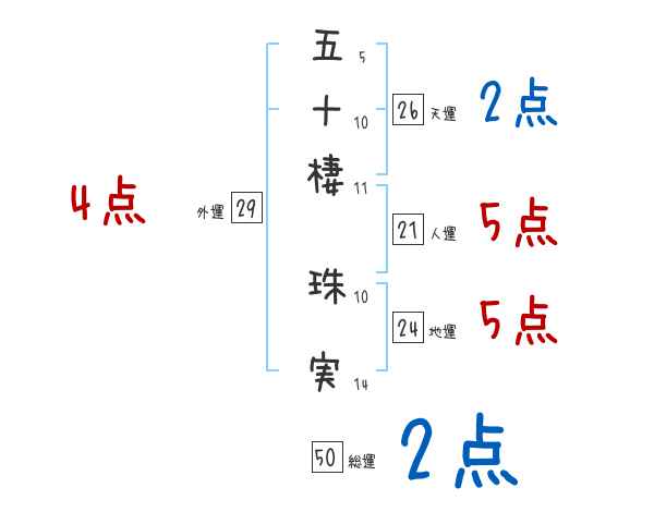 天運![]() | 五十棲珠実さんの天運は26画の2つ星!波瀾万丈かも。信頼できる人を大事にしましょう。 家系が持つ宿命的な運勢を表します。祖先から受け継いだ苗字ですので自分の力が及びません。家柄を象徴します。 |