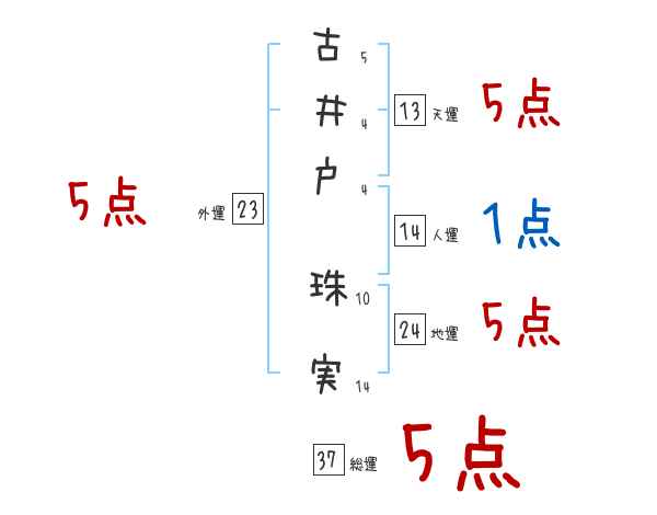総運![]() | 古井戸珠実さんの総運は37画の5つ星!努力家で順応性に優れる。現実的な考え方ができ忠実に物事をこなす。 あなたの人生を表す1番重要な運勢です。生涯を通じて影響する総合運となり、主に50歳以降の晩年期に影響を及ぼします。 |