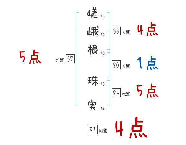 天運![]() | 嵯峨根珠実さんの天運は33画の4つ星!権力志向でプライドが高い。勇気があり運を切り開き成功する。 家系が持つ宿命的な運勢を表します。祖先から受け継いだ苗字ですので自分の力が及びません。家柄を象徴します。 |