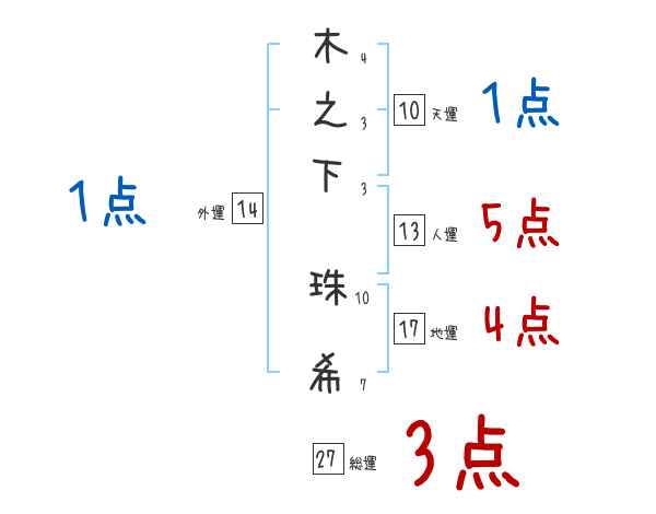 外運![]() | 木之下珠希さんの外運は14画の1つ星!人に対して優しいがストレスを溜め込みがち。人間関係のトラブルを避けるよう気をつけましょう。 生活面を象徴する運勢です。外部から受ける影響力を表し、結婚運、家庭運や職場、環境への順応性を表します。 |