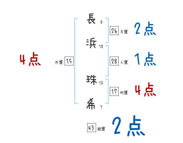 | 天運  | 長浜珠希さんの天運は26画の2つ星!波瀾万丈かも。信頼できる人を大事にしましょう。家系が持つ宿命的な運勢を表します。祖先から受け継いだ苗字ですので自分の力が及びません。家柄を象徴します。 |