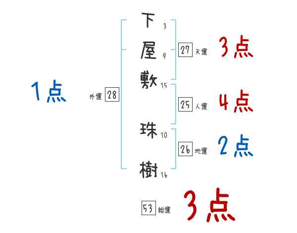 天運![]() | 下屋敷珠樹さんの天運は27画の3つ星!頭脳明晰だが強情で摩擦が多い傾向。孤立に注意。 家系が持つ宿命的な運勢を表します。祖先から受け継いだ苗字ですので自分の力が及びません。家柄を象徴します。 |