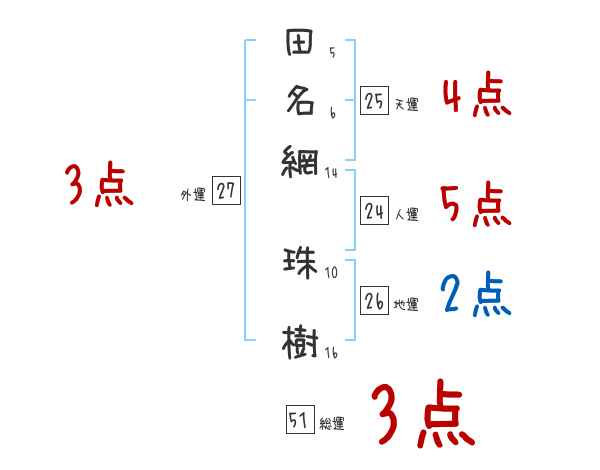 天運![]() | 田名網珠樹さんの天運は25画の4つ星!個性があり才能があふれる。強運の持ち主で発展する。 家系が持つ宿命的な運勢を表します。祖先から受け継いだ苗字ですので自分の力が及びません。家柄を象徴します。 |