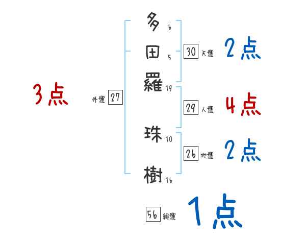 天運![]() | 多田羅珠樹さんの天運は30画の2つ星!浮き沈みの激しさに注意しましょう。 家系が持つ宿命的な運勢を表します。祖先から受け継いだ苗字ですので自分の力が及びません。家柄を象徴します。 |