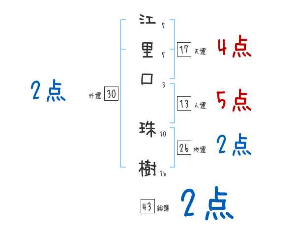 外運![]() | 江里口珠樹さんの外運は30画の2つ星!浮き沈みの激しさに注意しましょう。 生活面を象徴する運勢です。外部から受ける影響力を表し、結婚運、家庭運や職場、環境への順応性を表します。 |