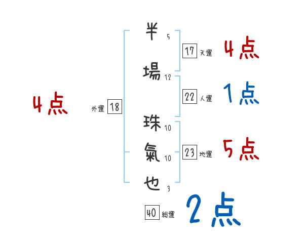 天運![]() | 半場珠氣也さんの天運は17画の4つ星!積極的な行動力。地位を気づき財産を手に入れる。純粋な心と直感力。 家系が持つ宿命的な運勢を表します。祖先から受け継いだ苗字ですので自分の力が及びません。家柄を象徴します。 |