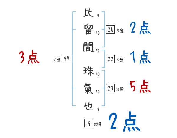 外運![]() | 比留間珠氣也さんの外運は27画の3つ星!頭脳明晰だが強情で摩擦が多い傾向。孤立に注意。 生活面を象徴する運勢です。外部から受ける影響力を表し、結婚運、家庭運や職場、環境への順応性を表します。 |