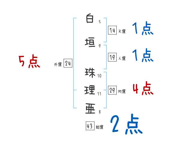 外運![]() | 白垣珠理亜さんの外運は24画の5つ星!家庭運が良く順調な人生。金運にも恵まれる。 生活面を象徴する運勢です。外部から受ける影響力を表し、結婚運、家庭運や職場、環境への順応性を表します。 |