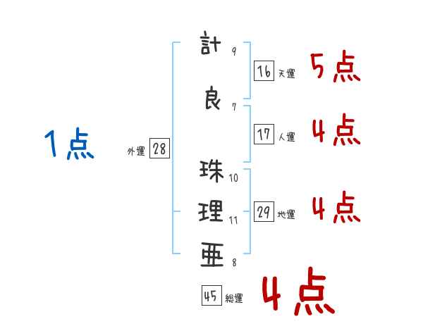 総運![]() | 計良珠理亜さんの総運は45画の4つ星!もくもくと物事を進め達成する。地味な努力家。 あなたの人生を表す1番重要な運勢です。生涯を通じて影響する総合運となり、主に50歳以降の晩年期に影響を及ぼします。 |