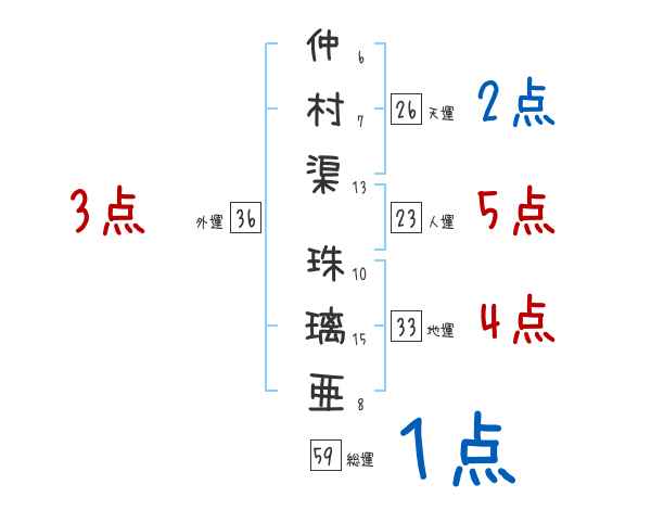 天運![]() | 仲村渠珠璃亜さんの天運は26画の2つ星!波瀾万丈かも。信頼できる人を大事にしましょう。 家系が持つ宿命的な運勢を表します。祖先から受け継いだ苗字ですので自分の力が及びません。家柄を象徴します。 |