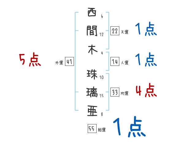 天運![]() | 西間木珠璃亜さんの天運は22画の1つ星!努力することが苦手ないっぽう手先が器用。芸術性にも優れる。 家系が持つ宿命的な運勢を表します。祖先から受け継いだ苗字ですので自分の力が及びません。家柄を象徴します。 |