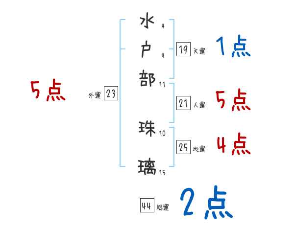 天運![]() | 水戸部珠璃さんの天運は19画の1つ星!優れた才能を持ちますが、協調性が足りないことも。周りの人と協力する事を意識しましょう。 家系が持つ宿命的な運勢を表します。祖先から受け継いだ苗字ですので自分の力が及びません。家柄を象徴します。 |