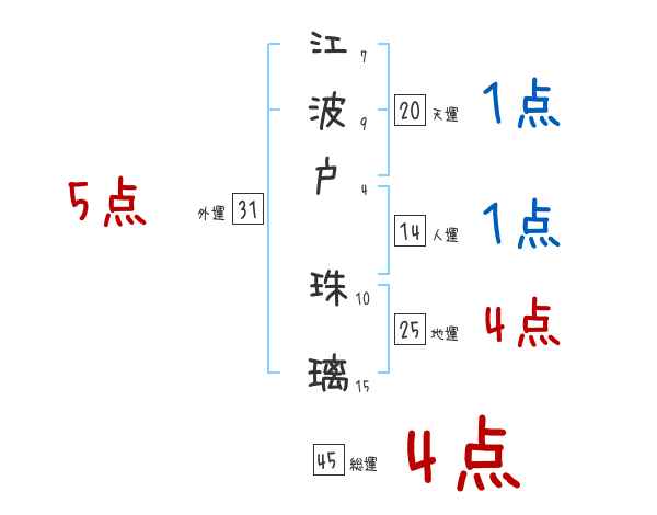 総運![]() | 江波戸珠璃さんの総運は45画の4つ星!もくもくと物事を進め達成する。地味な努力家。 あなたの人生を表す1番重要な運勢です。生涯を通じて影響する総合運となり、主に50歳以降の晩年期に影響を及ぼします。 |