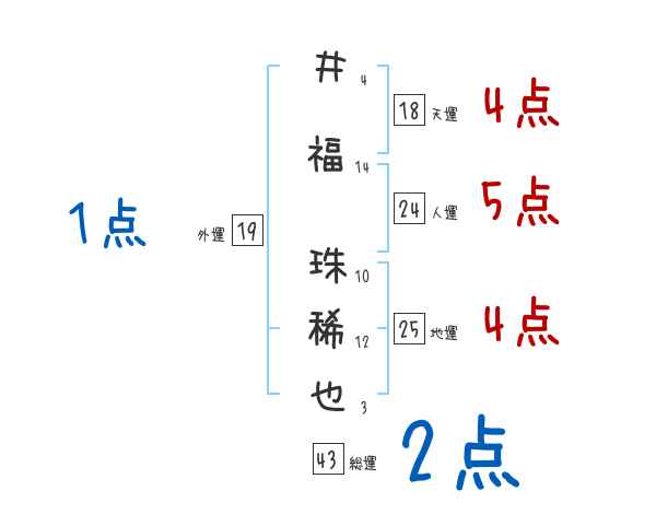 総運![]() | 井福珠稀也さんの総運は43画の2つ星!頑固な性格で独立心が強いかも。やや非現実的で浪費に注意しましょう。 あなたの人生を表す1番重要な運勢です。生涯を通じて影響する総合運となり、主に50歳以降の晩年期に影響を及ぼします。 |