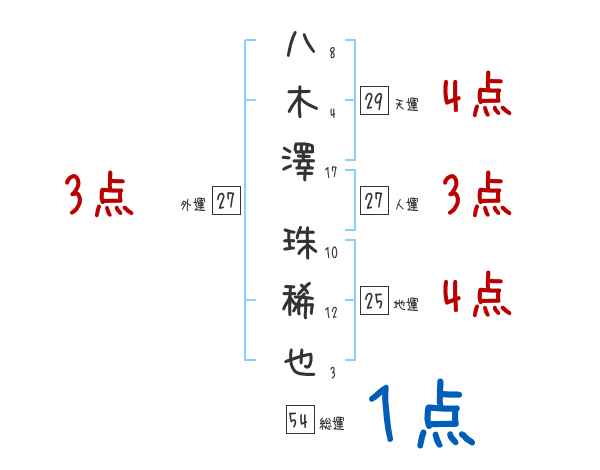 総運![]() | 八木澤珠稀也さんの総運は54画の1つ星!トラブルが多いかも。周りをよく見て協調して過ごしましょう。 あなたの人生を表す1番重要な運勢です。生涯を通じて影響する総合運となり、主に50歳以降の晩年期に影響を及ぼします。 |