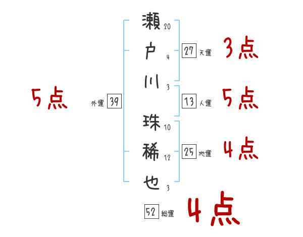 外運![]() | 瀬戸川珠稀也さんの外運は39画の5つ星!社交性に優れ人望が厚い。人の上に立ち成功する。 生活面を象徴する運勢です。外部から受ける影響力を表し、結婚運、家庭運や職場、環境への順応性を表します。 |