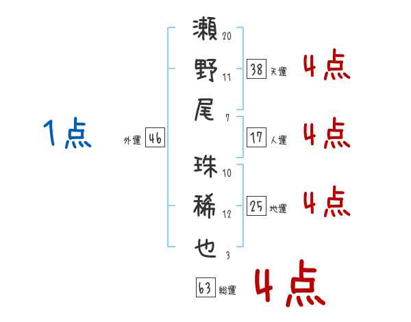 瀬野尾珠稀也さんの画数の鑑定結果