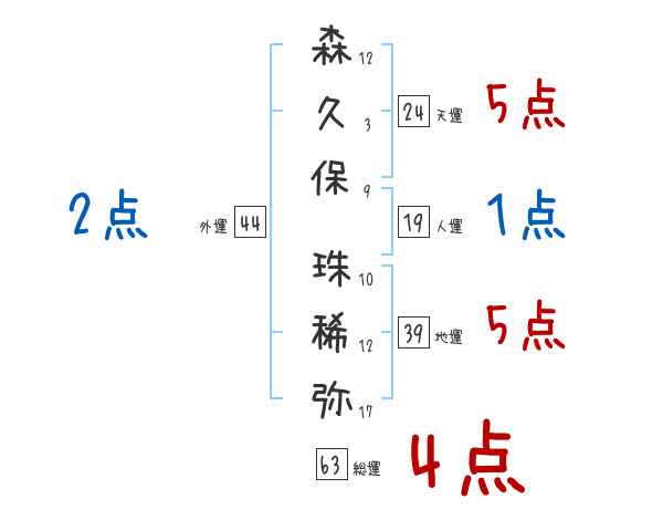 外運![]() | 森久保珠稀弥さんの外運は44画の2つ星!誠実で慎重な性格。物事を考えすぎないように注意しましょう。 生活面を象徴する運勢です。外部から受ける影響力を表し、結婚運、家庭運や職場、環境への順応性を表します。 |