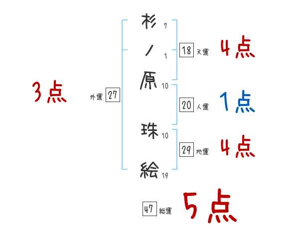 総運![]() | 杉ノ原珠絵さんの総運は47画の5つ星!実力が開花し発展する円満な人生。財に恵まれる。 あなたの人生を表す1番重要な運勢です。生涯を通じて影響する総合運となり、主に50歳以降の晩年期に影響を及ぼします。 |