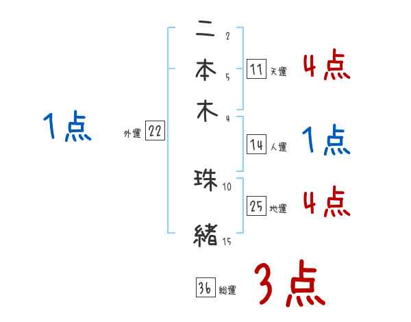 天運![]() | 二本木珠緒さんの天運は11画の4つ星!着実に富や地位を得る幸運な人生。 家系が持つ宿命的な運勢を表します。祖先から受け継いだ苗字ですので自分の力が及びません。家柄を象徴します。 |