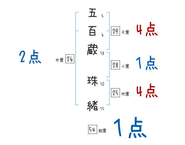 天運![]() | 五百蔵珠緒さんの天運は29画の4つ星!完全主義で才能がある。厳格な心の持ち主。 家系が持つ宿命的な運勢を表します。祖先から受け継いだ苗字ですので自分の力が及びません。家柄を象徴します。 |