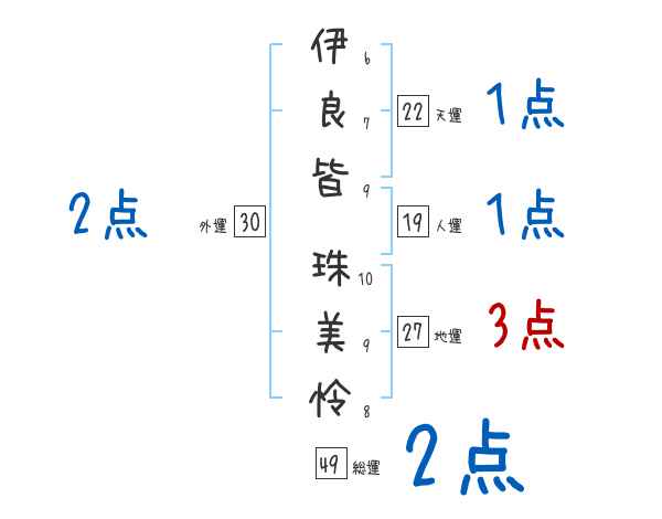 地運![]() | 伊良皆珠美怜さんの地運は27画の3つ星!頭脳明晰だが強情で摩擦が多い傾向。孤立に注意。 個性を表す基礎的な運勢です。性格形成や対人関係、行動力など家庭環境に影響されます。主に誕生してから20歳くらいまでの若年期の運勢を表します。 |