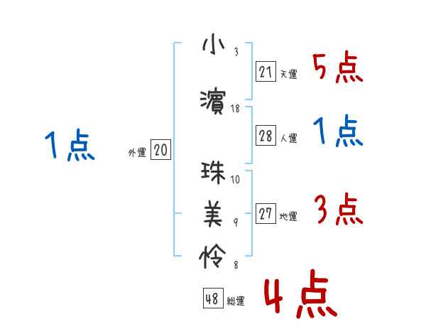 天運![]() | 小濵珠美怜さんの天運は21画の5つ星!統率力がある。独立し成功する。名誉を手に入れる。 家系が持つ宿命的な運勢を表します。祖先から受け継いだ苗字ですので自分の力が及びません。家柄を象徴します。 |