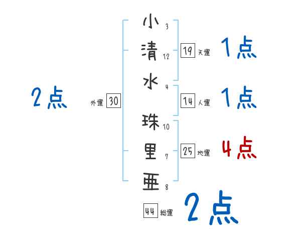 外運![]() | 小清水珠里亜さんの外運は30画の2つ星!浮き沈みの激しさに注意しましょう。 生活面を象徴する運勢です。外部から受ける影響力を表し、結婚運、家庭運や職場、環境への順応性を表します。 |