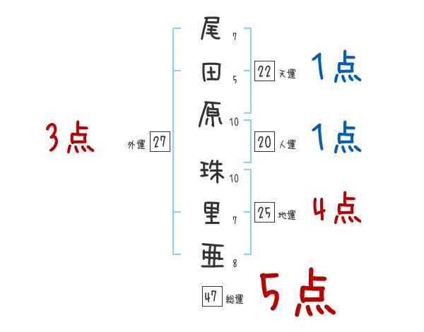 外運![]() | 尾田原珠里亜さんの外運は27画の3つ星!頭脳明晰だが強情で摩擦が多い傾向。孤立に注意。 生活面を象徴する運勢です。外部から受ける影響力を表し、結婚運、家庭運や職場、環境への順応性を表します。 |