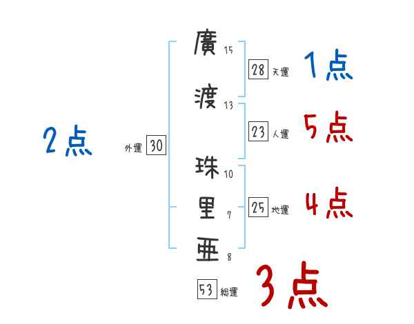 人運![]() | 廣渡珠里亜さんの人運は23画の5つ星!想像力に優れ活力がある。一代で成功し名誉を手に入れる。 性格や才能などを表す2番目に重要な運勢です。人間関係や協調性、社会的な成功に影響します。主に20歳から50歳ぐらいまでの中年期の運勢を表します。 |