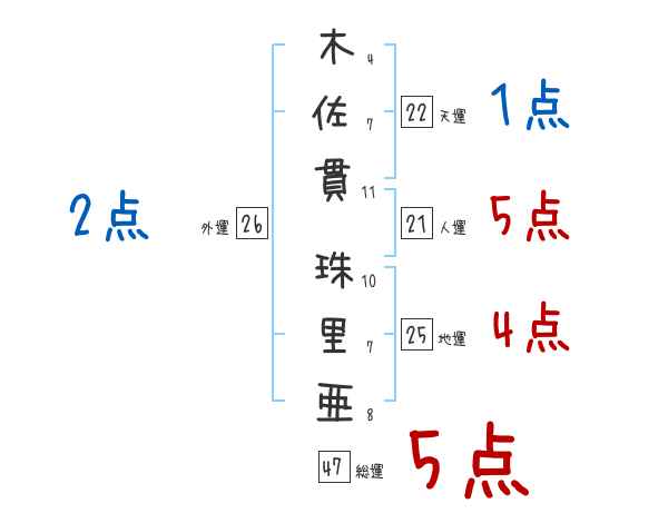総運![]() | 木佐貫珠里亜さんの総運は47画の5つ星!実力が開花し発展する円満な人生。財に恵まれる。 あなたの人生を表す1番重要な運勢です。生涯を通じて影響する総合運となり、主に50歳以降の晩年期に影響を及ぼします。 |